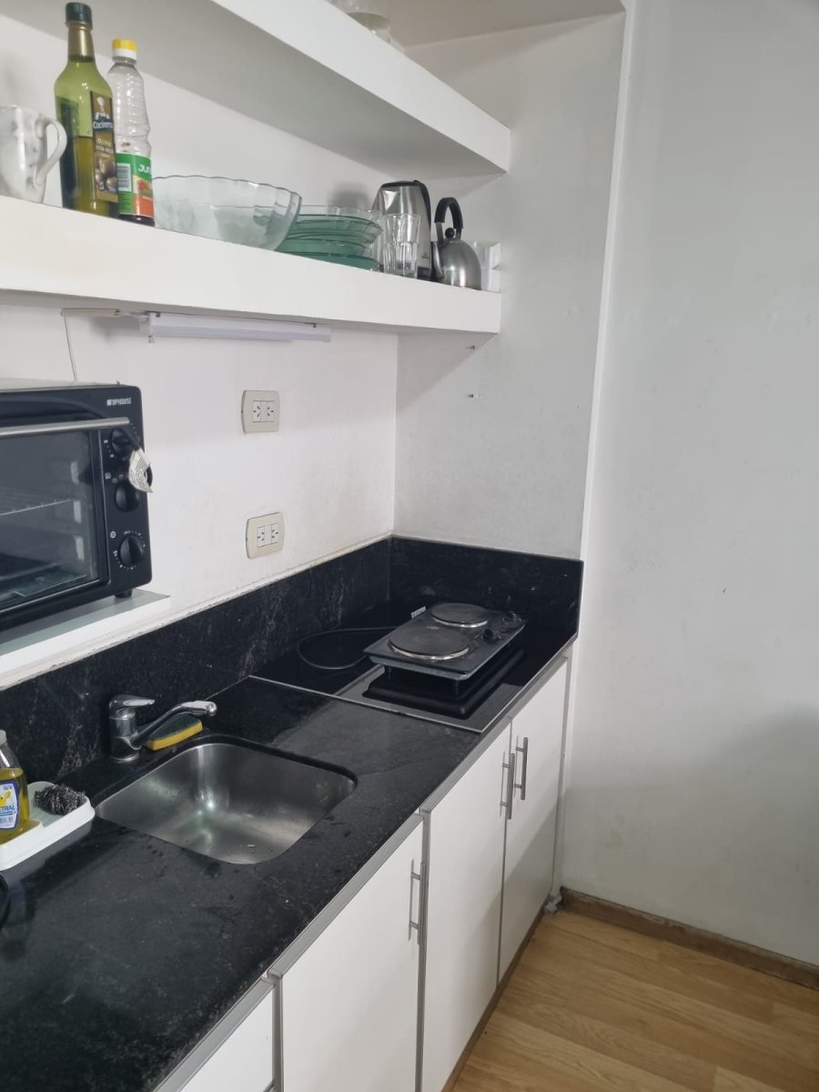 El ambiente integra living y dormitorio con TV, y una cocina eléctrica equipada con dos anafes, horno eléctrico y microondas, perfecta para resolver comidas diarias. Baño completo. El edificio ofrece solarium y parrilla, sumando opciones para disfrutar al aire libre.