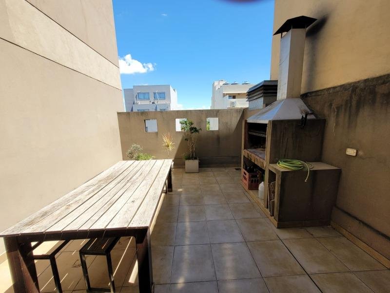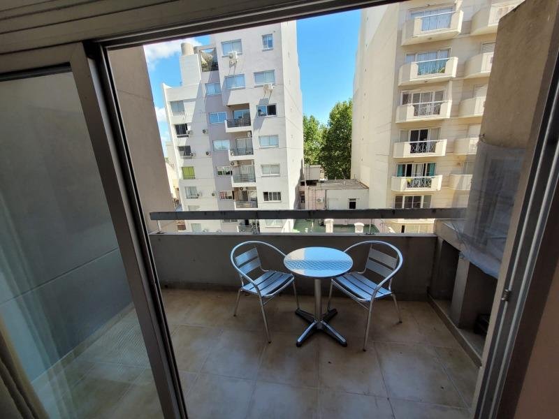 * Balcón con parrilla, mesa con 2 sillas, vista abierta al contrafrente del edificio.