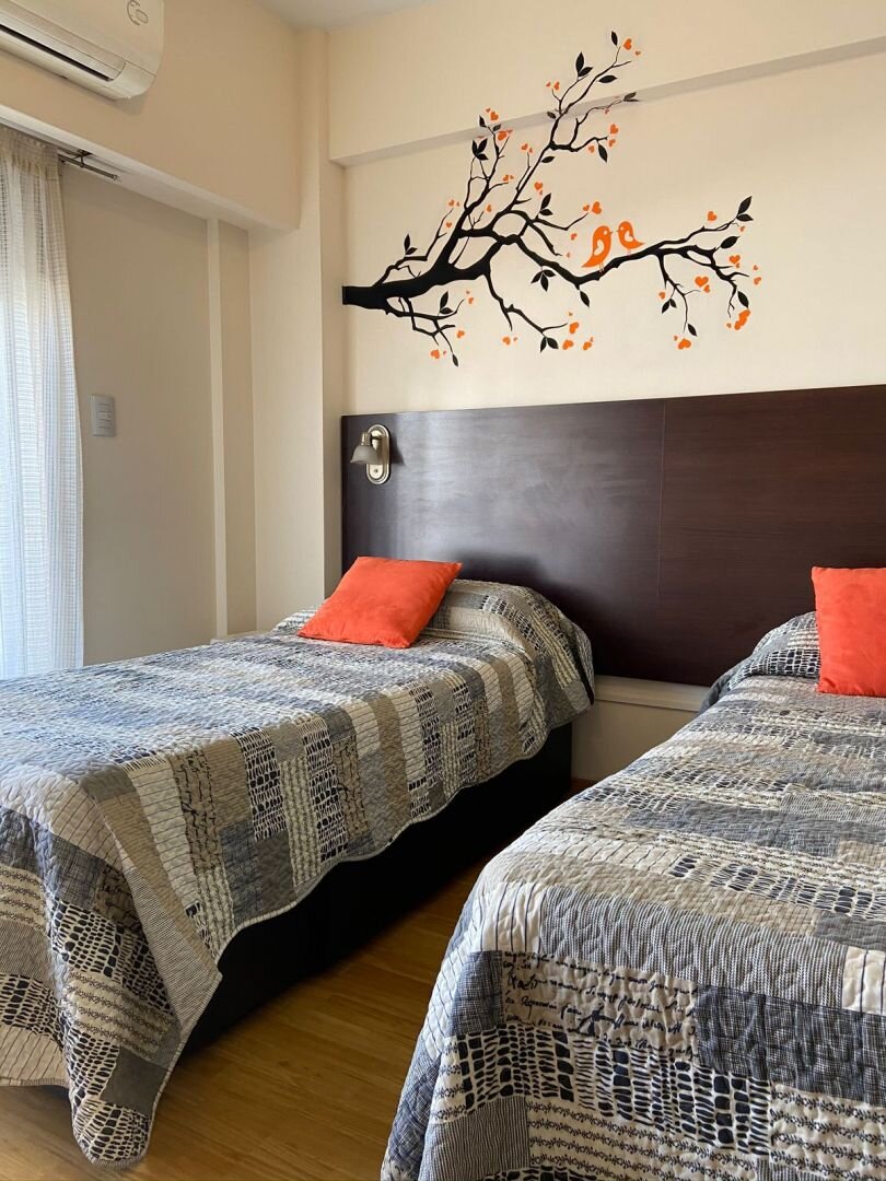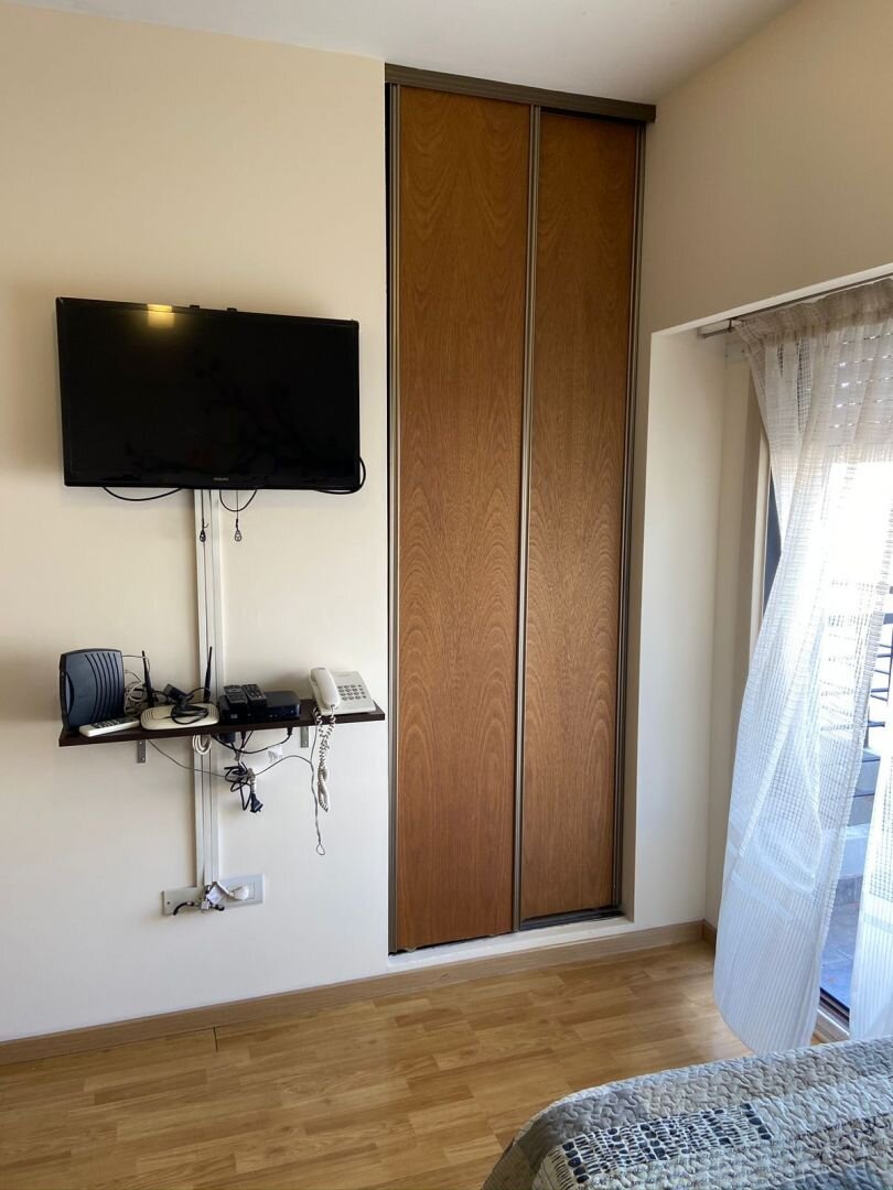 El departamento cuenta con kitchenette equipada con horno eléctrico, anafe eléctrico, microondas y heladera bajo mesada. El ambiente tiene salida al balcón y está equipado con dos sommiers de una plaza, mesa con dos sillas, TV LCD de 32”, centro musical, DVD y teléfono.